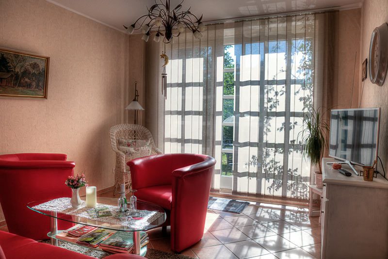 Zwei Fenster des Zimmers sind nach Süden gerichtet. Eine große Terrasse mit Ausgang nach Westen in den eigenen total geschützten Garten sorgt für viel Licht.