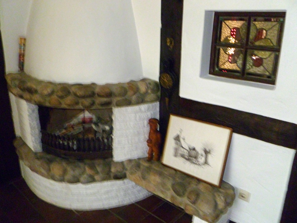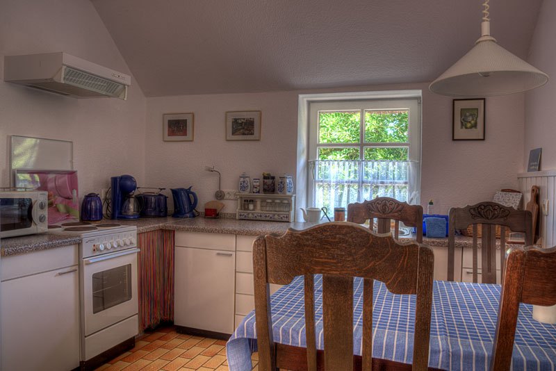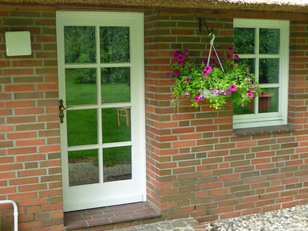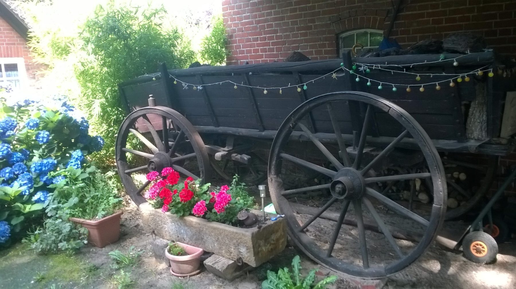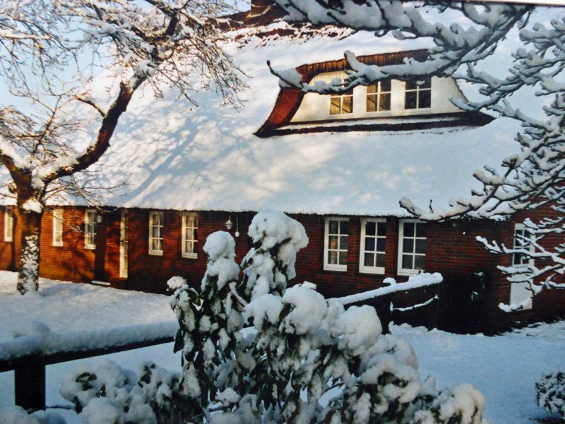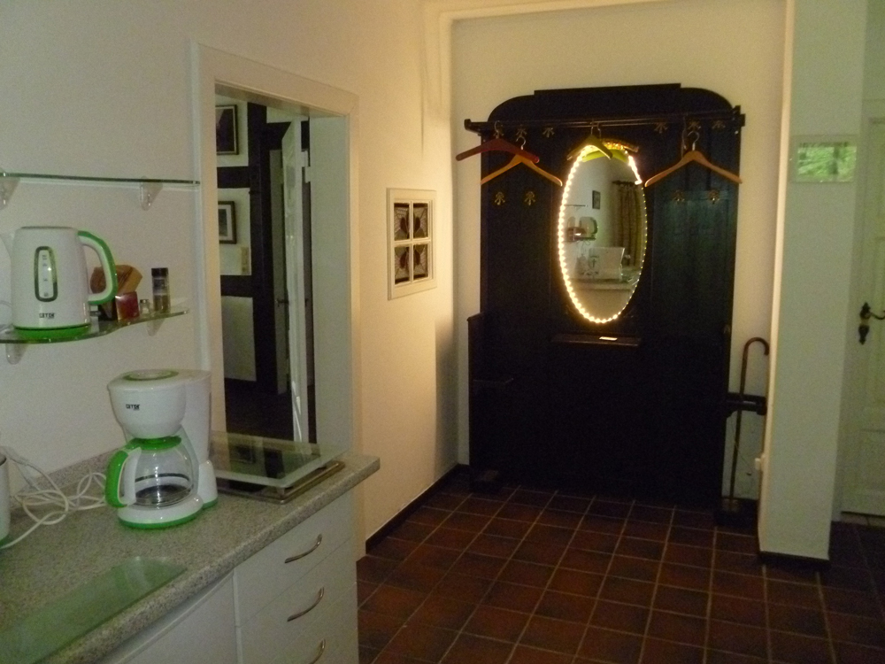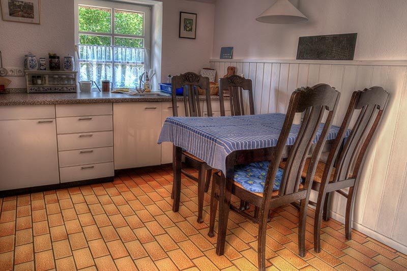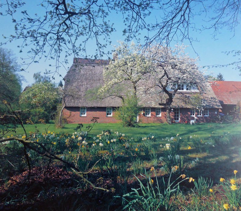 Schmuckstück ist das sehr gemütliche Wohnzimmer mit Fachwerk und Deckenbalken, einem offenen Kamin und einer gelungenen Mischung aus alten Worpsweder Bauernmöbeln und modernem Inventar.