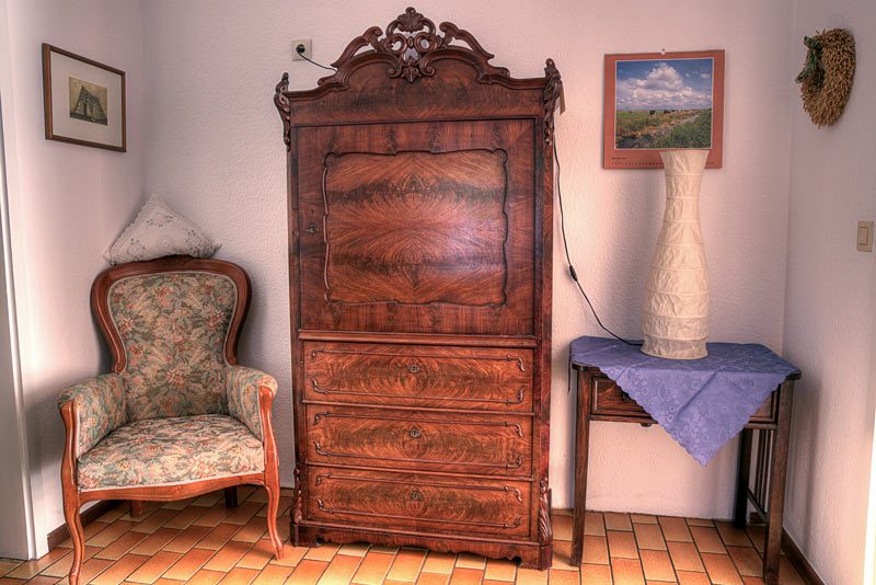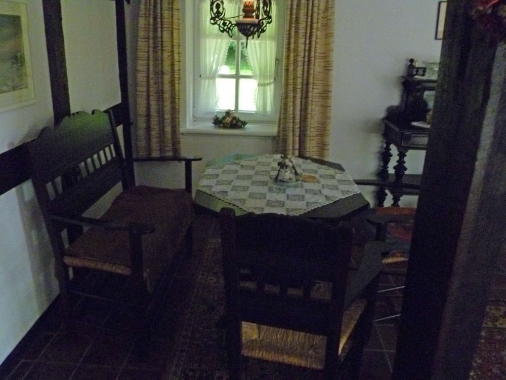 Den Essplatz – eine herrliche Sitzecke mit alten Worpsweder Bauernmöbeln – finden sie nur wenige Schritte weiter im Wohnzimmer.