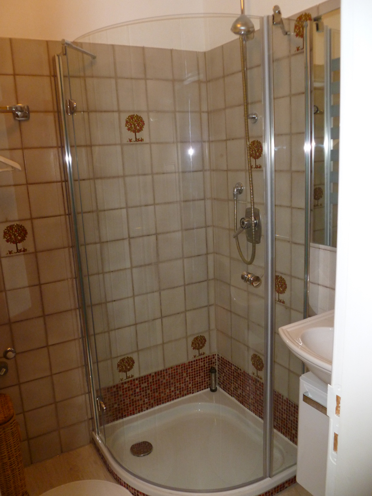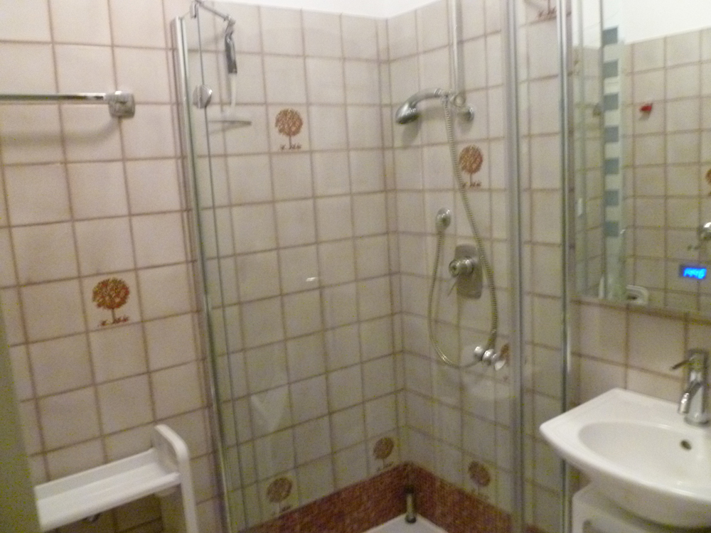 Das hochwertige, freundliche und moderne Duschbad ist ausgestattet mit Edelglas-Eckdusche und Waschbecken. Föhn und Duschhocker sind vorhanden.
