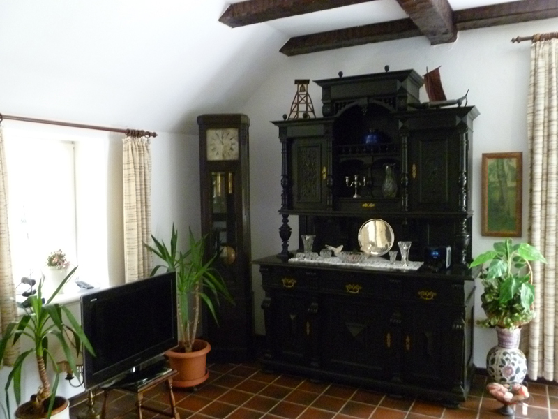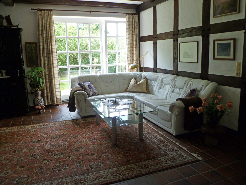 Fachwerk und Deckenbalken sowie eine reizvolle Mischung von alten Worpsweder Möbeln und einer modernen Couchgarnitur erzeugen eine ganz besondere Atmosphäre.